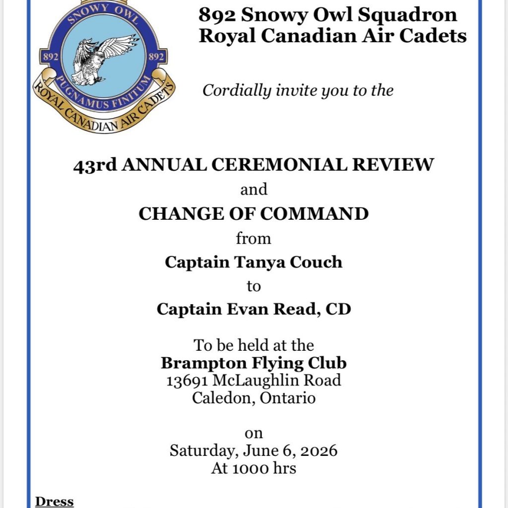 ACR: Saturday, June 6, 2026 at 892 LHQ, Brampton Flying Club, 13691 McLaughlin Rd, Cheltenham. Dress: C3 (summer dress).